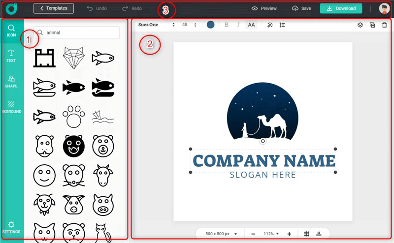 1. Elements: DesignEvo is equipped with an icon library, selected shapes, fonts, and background colors. By shifting the relevant tabs on the side panel, you can add different elements correspondingly.