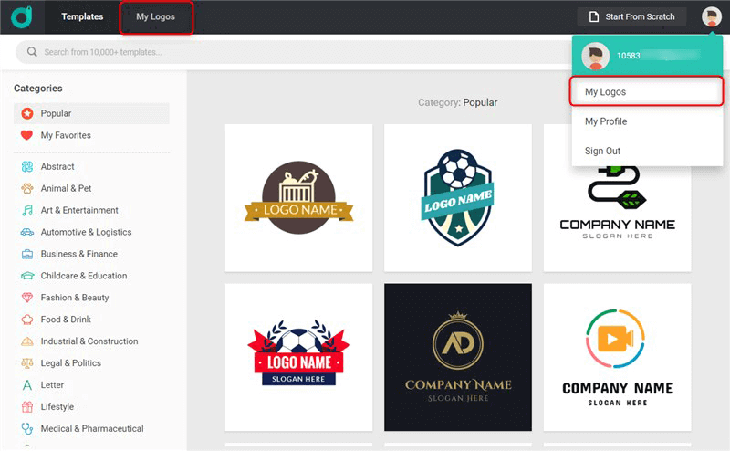 After logging in, click My Logos in the drop-down menu below the avatar. Or switch to My Logos on the top tool bar after entering the template module.